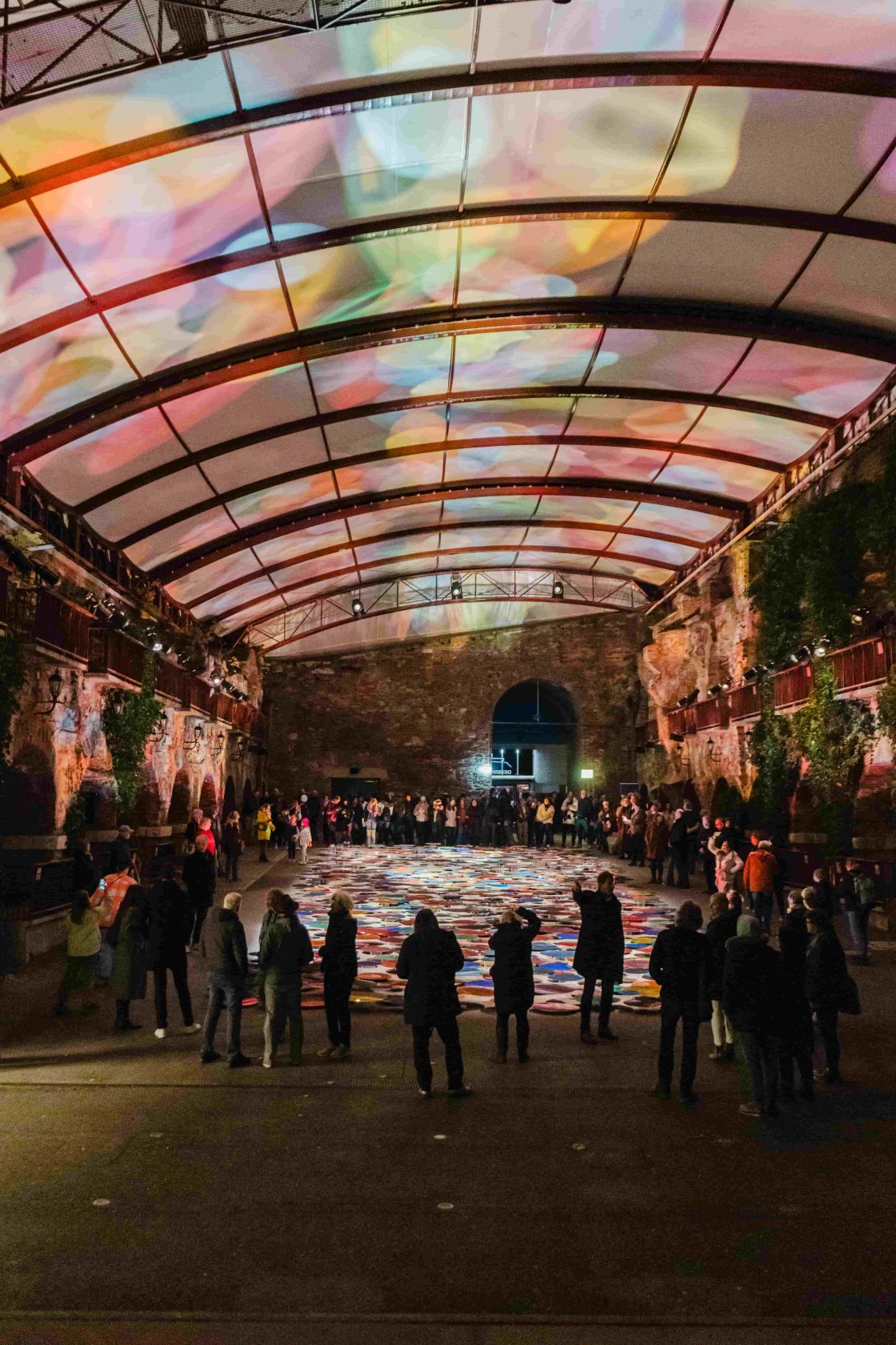 „Our Colour Reflection“ gleicht einem Farbrausch: Mehr als 700 farbige Spiegel erstrecken sich über den Boden der Grazer Schloßbergkasematten. In unterschiedlichen Durchmessern und verschiedenen Höhen reflektieren die Spiegel sowohl die Architektur als auch die Menschen. Farben und Formen werden in den Raum projiziert. Es tut sich eine spielerische und bunte, zugleich elegant anmutende Welt auf, die der steten Veränderung unterliegt: Beeinflusst durch die Bewegungen des Publikums entstehen immer wieder neue Momente und Perspektiven. So wird das Kunstwerk von Liz West zu einem fließenden Austausch zwischen Betrachtenden und Umgebung, zwischen eigenen Perspektiven und raumgreifender Installation.