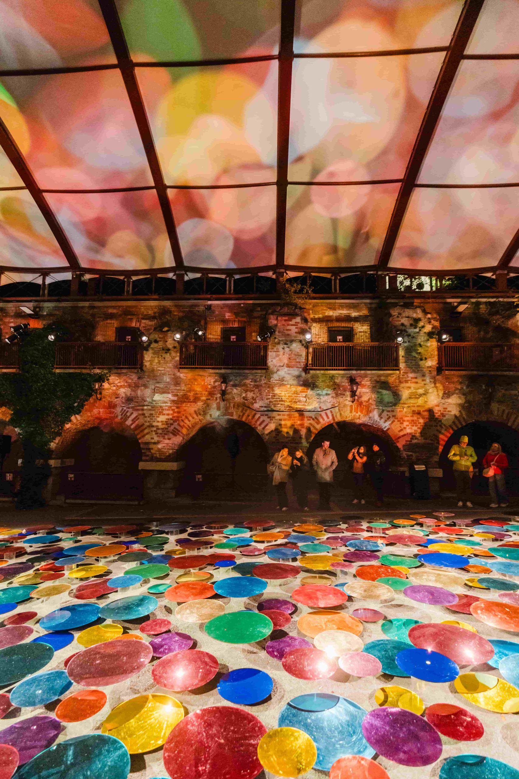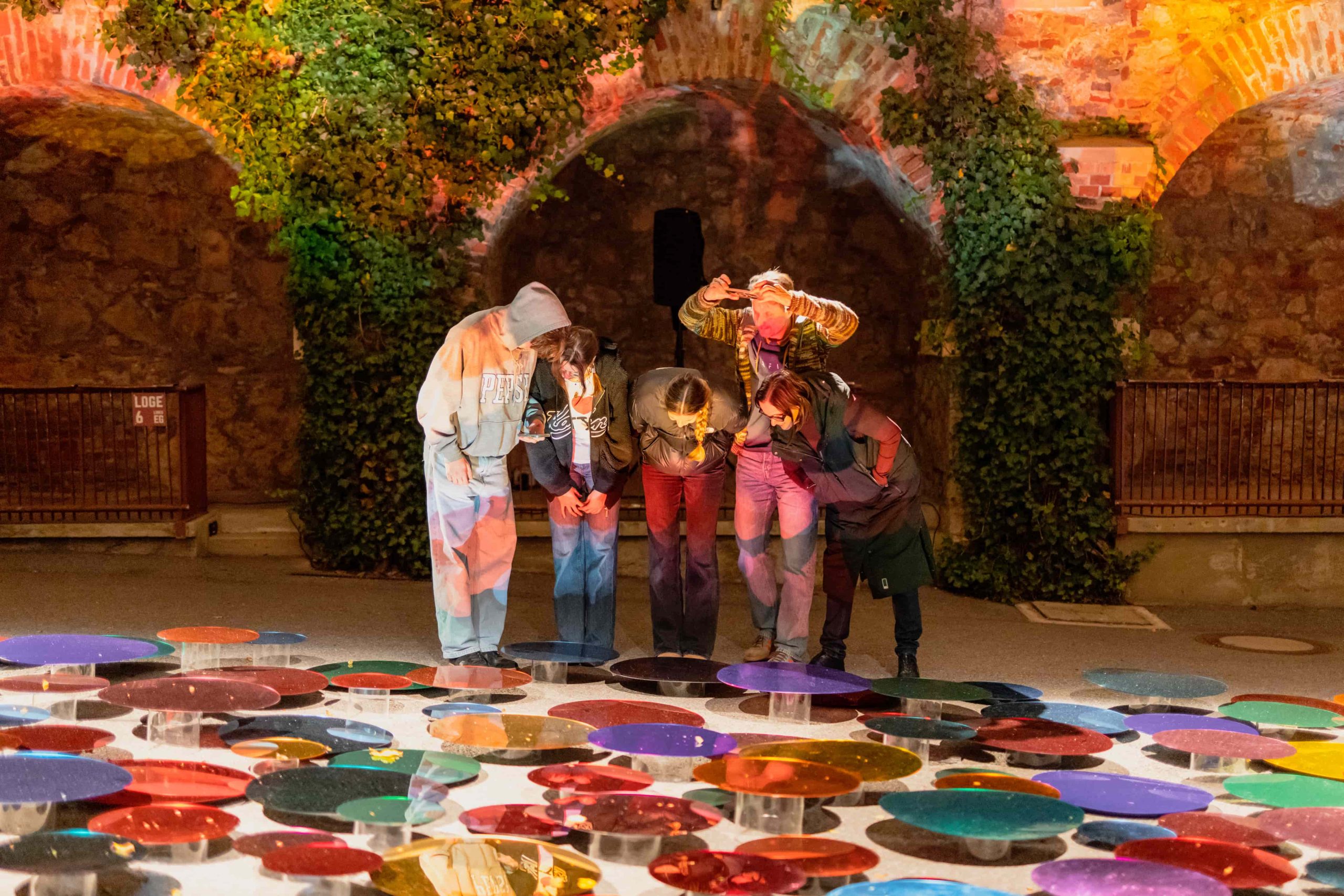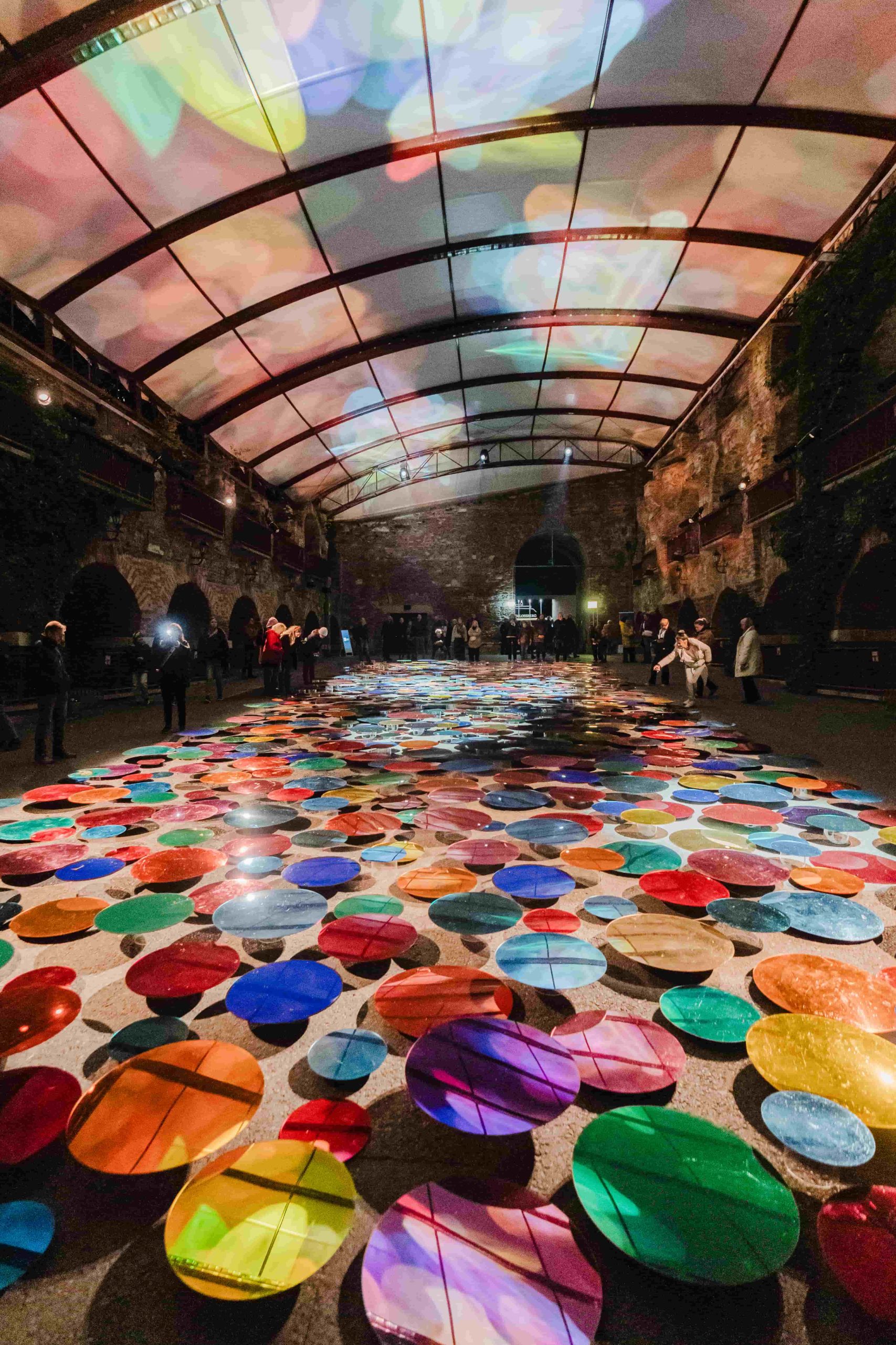 „Our Colour Reflection“ gleicht einem Farbrausch: Mehr als 700 farbige Spiegel erstrecken sich über den Boden der Grazer Schloßbergkasematten. In unterschiedlichen Durchmessern und verschiedenen Höhen reflektieren die Spiegel sowohl die Architektur als auch die Menschen. Farben und Formen werden in den Raum projiziert. Es tut sich eine spielerische und bunte, zugleich elegant anmutende Welt auf, die der steten Veränderung unterliegt: Beeinflusst durch die Bewegungen des Publikums entstehen immer wieder neue Momente und Perspektiven. So wird das Kunstwerk von Liz West zu einem fließenden Austausch zwischen Betrachtenden und Umgebung, zwischen eigenen Perspektiven und raumgreifender Installation.