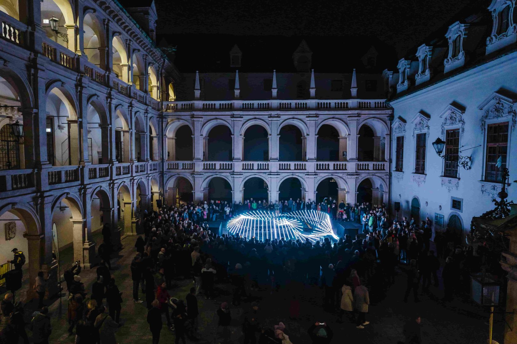 „Flux“ von Collectif Scale entstand 2021 im Rahmen des Constellations Festivals in Metz, Frankreich, reist seither durch die ganze Welt und macht bei KLANGLICHT 2025 im Grazer Landhaushof Station. Die sich bewegende, modulare Form und ihre Leuchtkraft zieht Menschen allerorts in ihren Bann. Die Vervielfachung des einfachen Lichtkörpers, die Dynamik der Installation sowie die Variationen zeitlicher Phasen und Geschwindigkeit erschaffen den Eindruck eines scheinbar organischen Objekts, das den Betrachtenden einmal in poetischen, ein andermal in frenetischen Wellen begegnet.