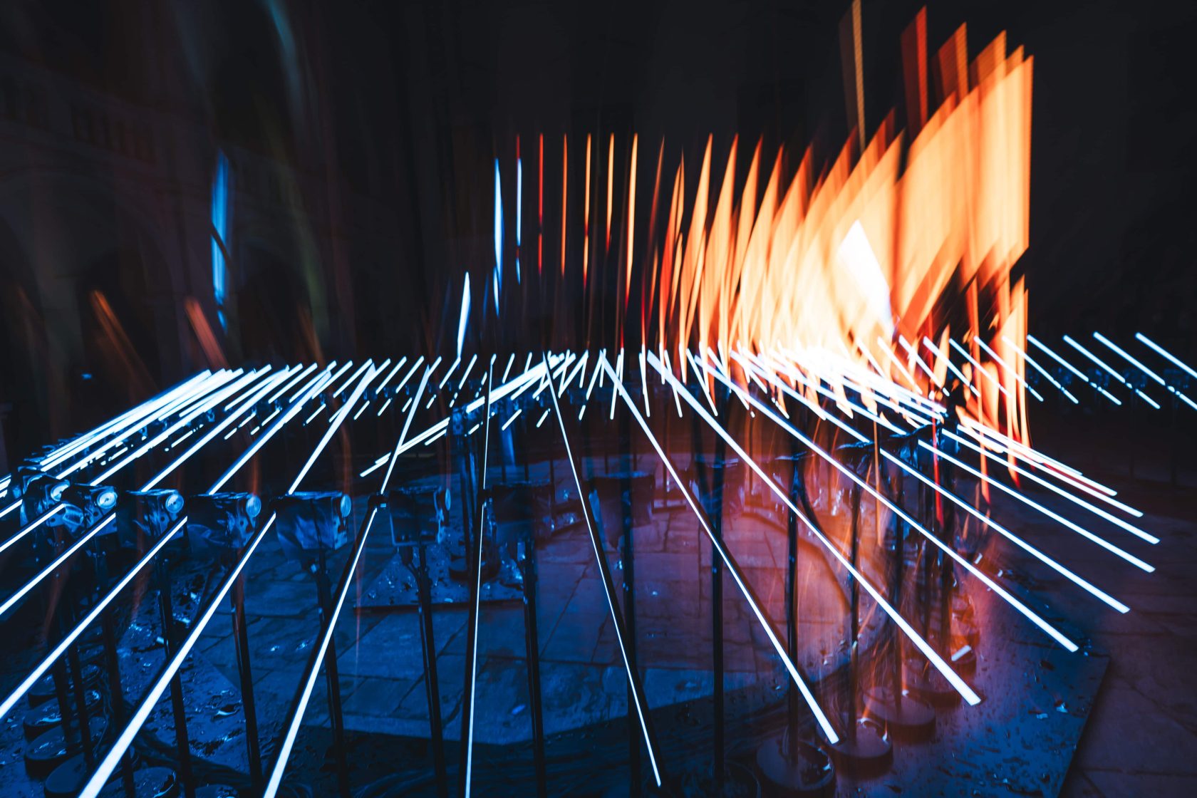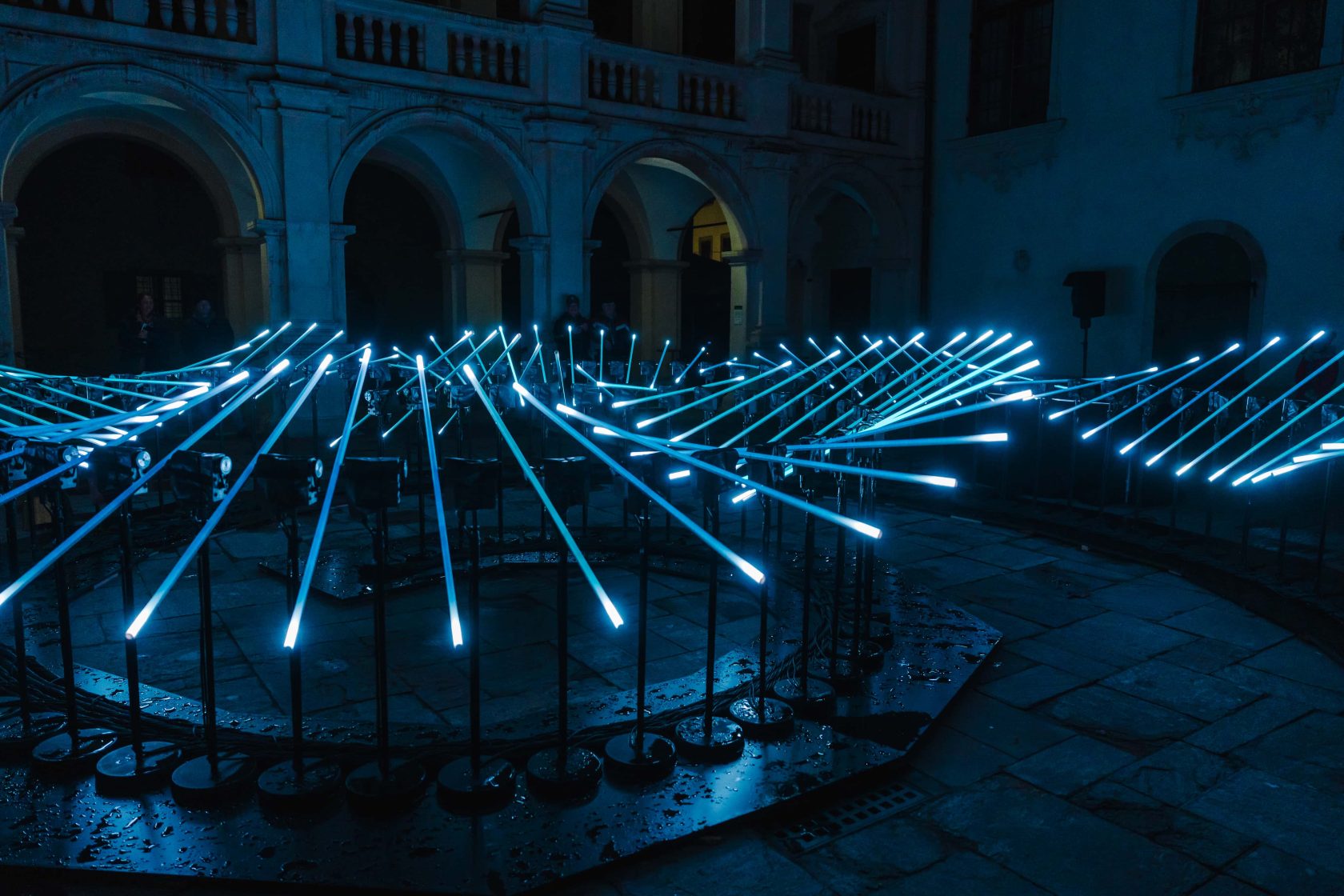 Wie mit anderen Arbeiten hinterfragt das Künstlerkollektiv auch mit der sinnlichen und zugleich spielerischen Installation „Flux“ die Verbindung von Licht und Architektur, Unterhaltung und Kunst, von Natur, Mensch und Maschine.