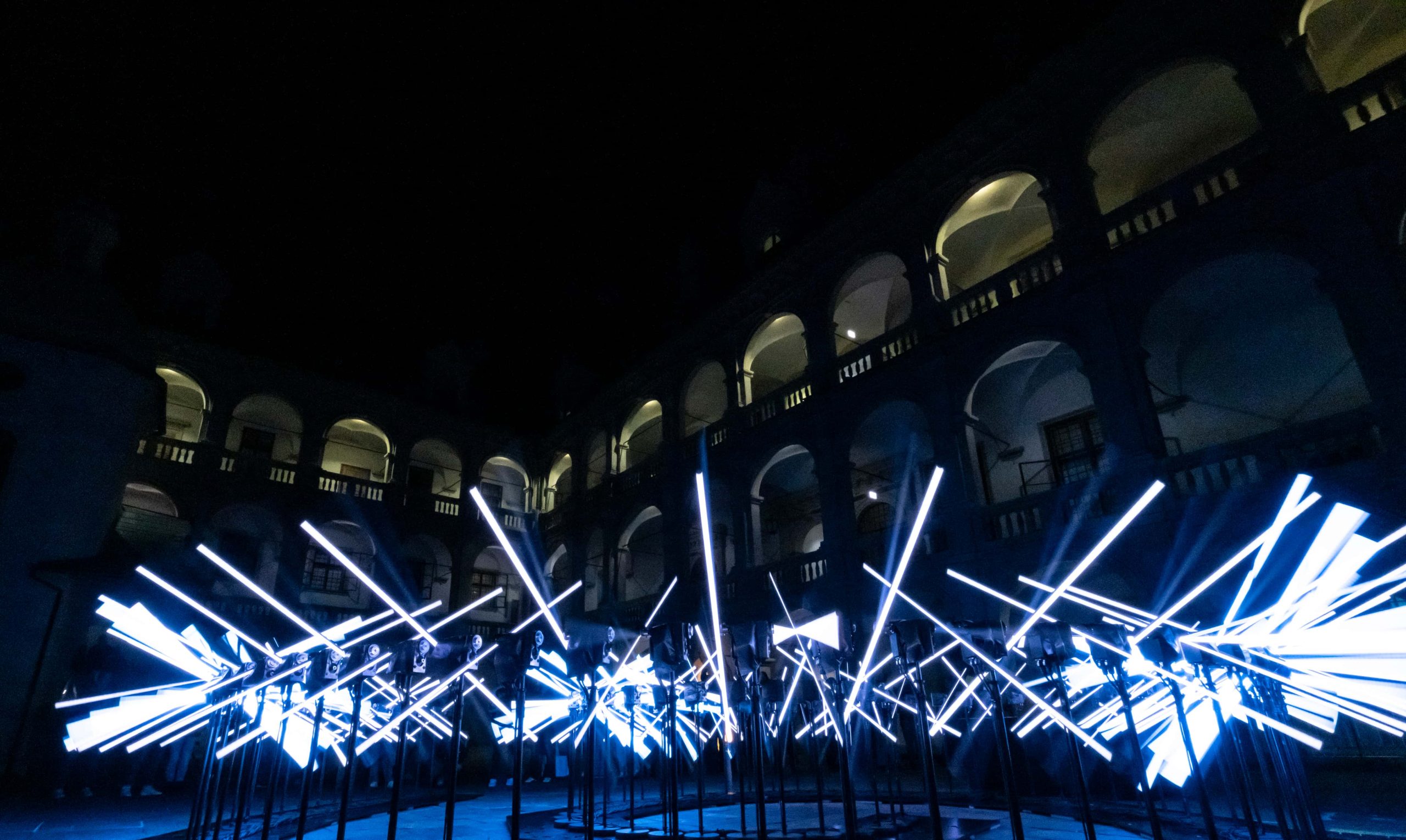 „Flux“ von Collectif Scale entstand 2021 im Rahmen des Constellations Festivals in Metz, Frankreich, reist seither durch die ganze Welt und macht bei KLANGLICHT 2025 im Grazer Landhaushof Station. Die sich bewegende, modulare Form und ihre Leuchtkraft zieht Menschen allerorts in ihren Bann. Die Vervielfachung des einfachen Lichtkörpers, die Dynamik der Installation sowie die Variationen zeitlicher Phasen und Geschwindigkeit erschaffen den Eindruck eines scheinbar organischen Objekts, das den Betrachtenden einmal in poetischen, ein andermal in frenetischen Wellen begegnet.