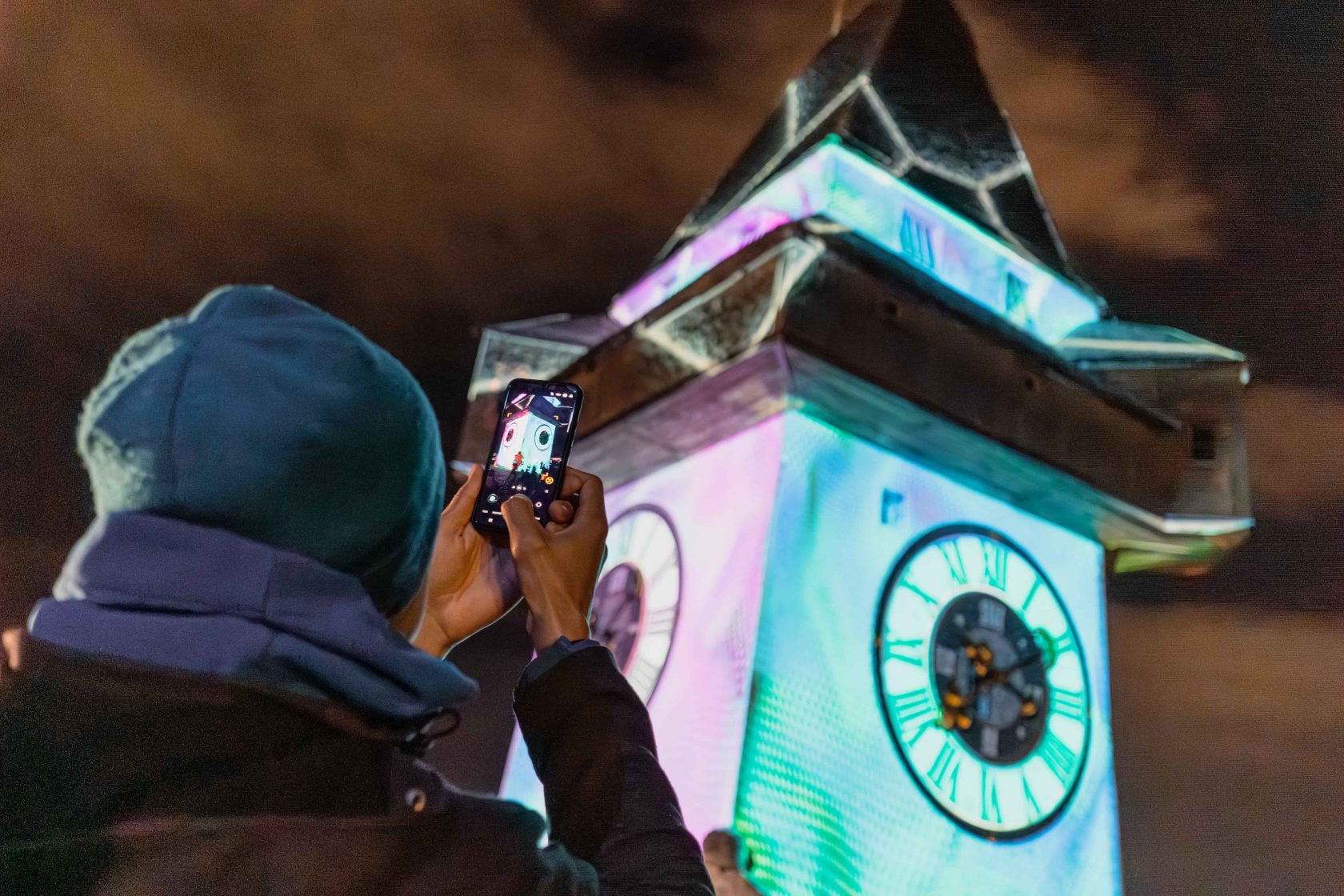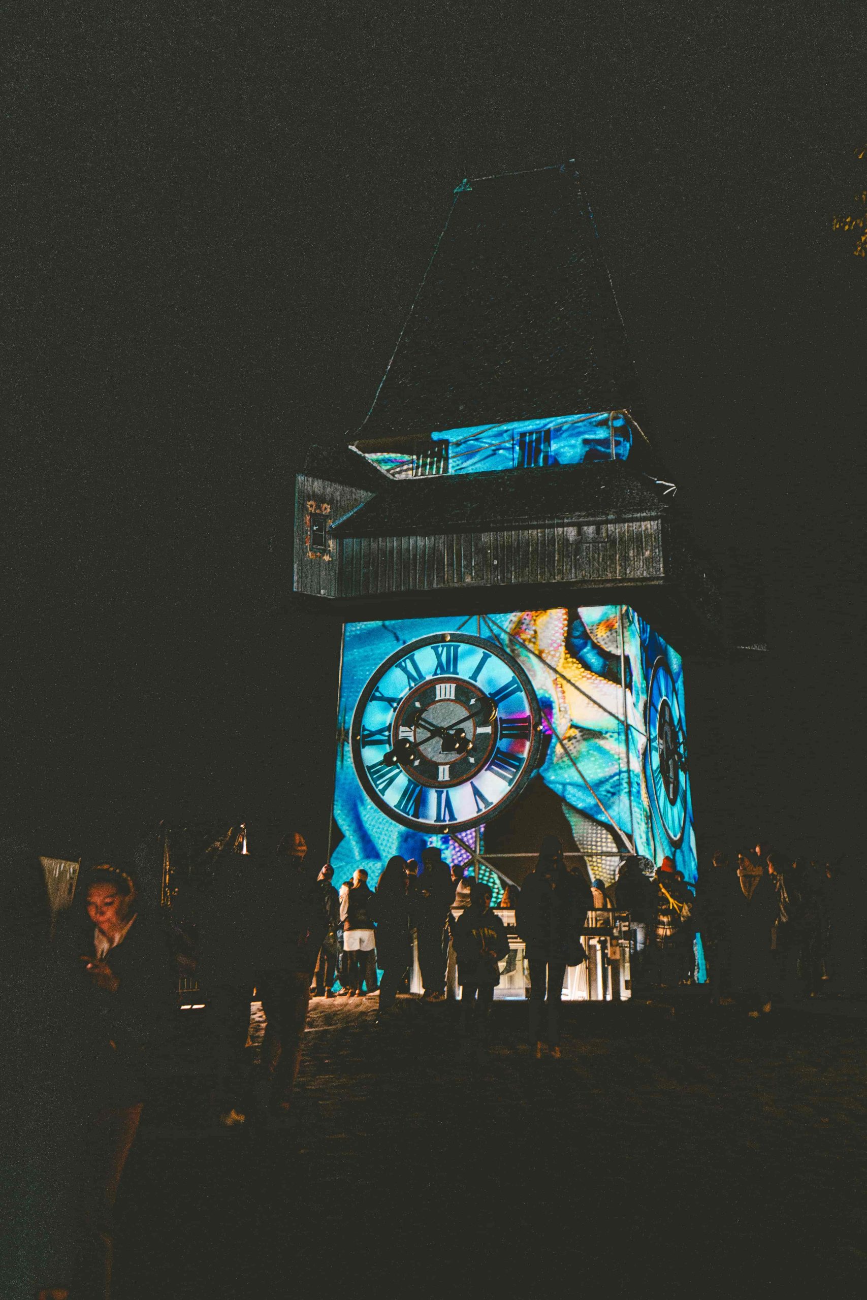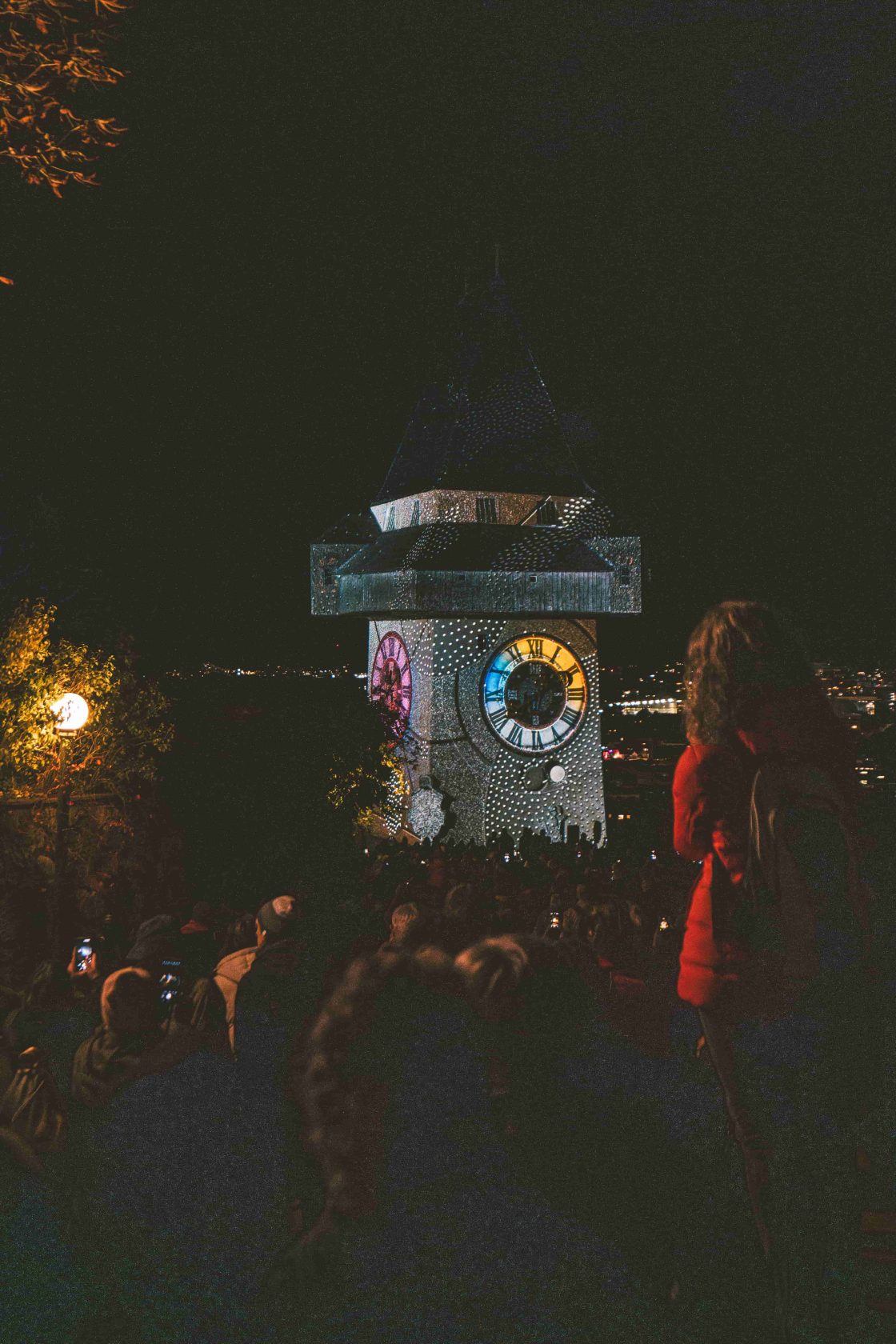 In den Architekturprojektionen von Julian Hölscher geht die analoge Wirklichkeit stets im digitalen Bildgeschehen auf: Es ist ein Zusammenspiel zwischen dem Realen und Projizierten – eingebettet in einen narrativen Kontext. Im Fall von „Pochen“ am Grazer Uhrturm handelt es sich um eine vielschichtige, mehrdeutige Erzählung. Die abstrakte Arbeit changiert zwischen Schnelle und Langsamkeit, zwischen klarem Klang und scheinbarem Geräusch, zwischen An- und Entspannung. Die Projektion lässt die Konturen des Wahrzeichens verschwimmen, sie vage erscheinen und somit zur visuellen Herausforderung für das Publikum werden.