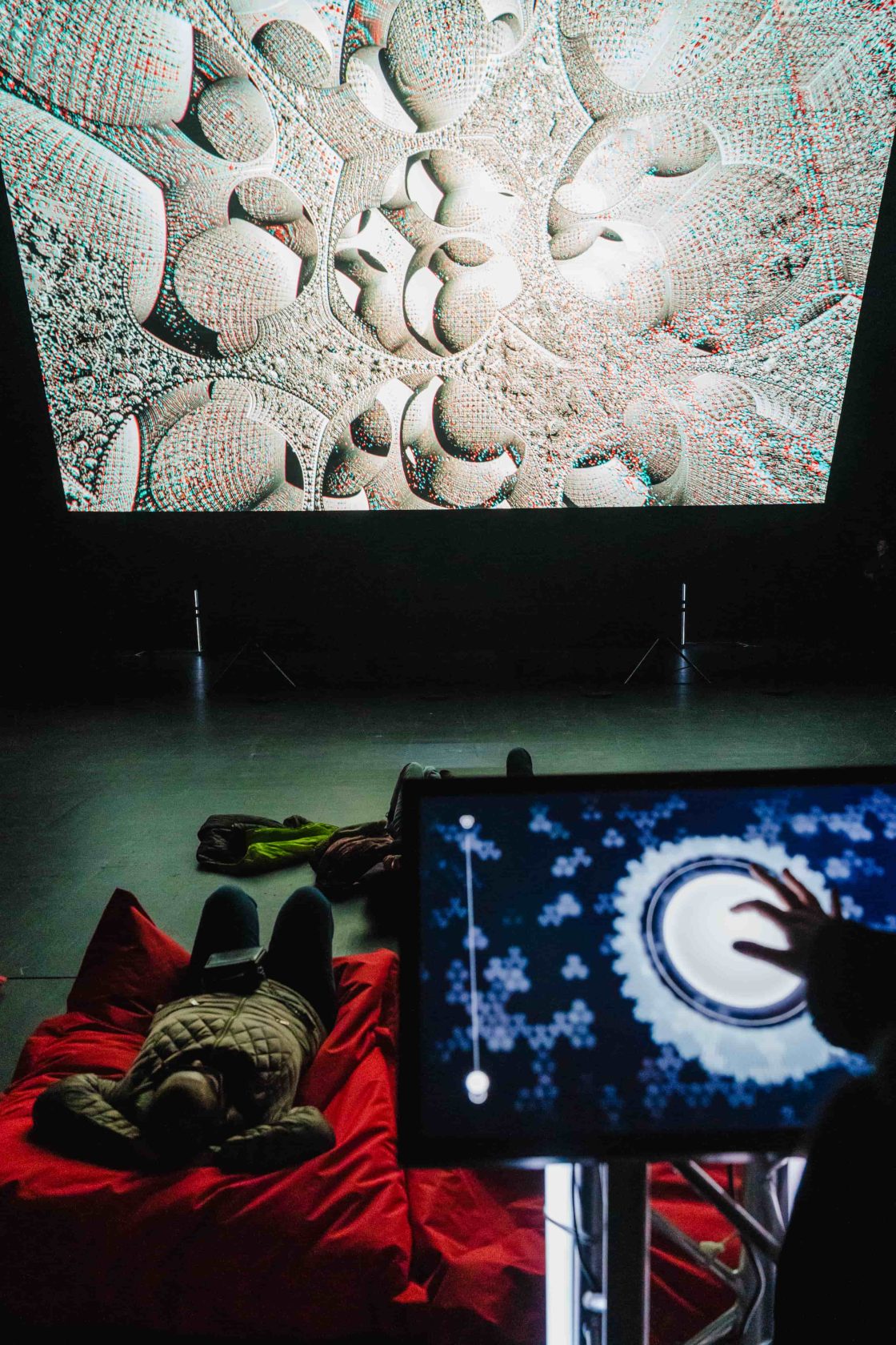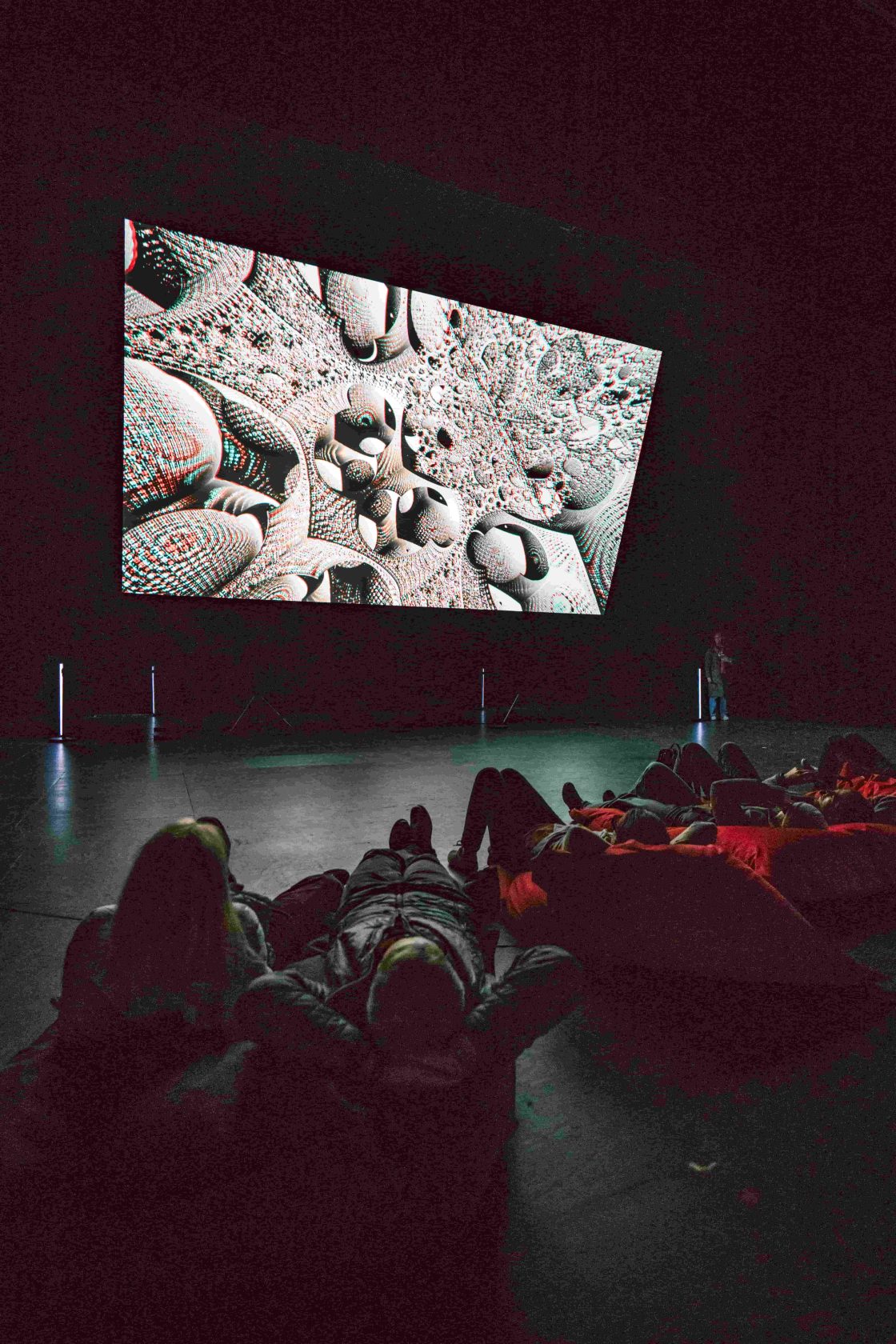 „Mantra Modulation“ verbindet Vergangenheit und Gegenwart: Auf der Bühne des Schauspielhauses erwacht eine virtuelle kinetische Skulptur mittels 3D-Brillen zum Leben. Im Einklang mit den visuellen Bewegungen entfaltet sich ein generativer Klangteppich. Das Publikum ist dabei nicht nur eingeladen, in diesen Raum der Illusion einzutauchen, sondern auch mitzuwirken: An einem interaktiven Pult können die visuellen und auditiven Elemente des Werkes moduliert werden: Jede Berührung formt die Welt, die sich vor den Augen der Besucher:innen auftut und erzählt ihnen eine eigene, ganz individuelle Geschichte. Diese Art der Co-Creation verwischt die Grenzen zwischen Kunst und Publikum und schafft eine persönliche Verbindung zur Installation.