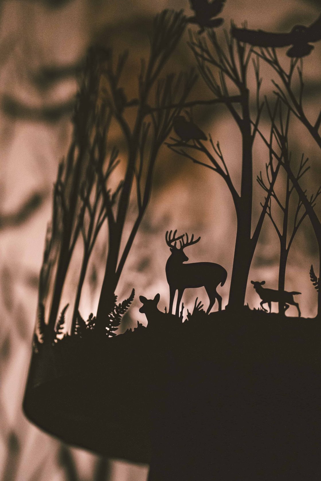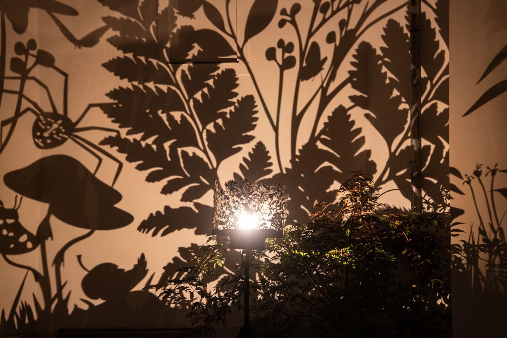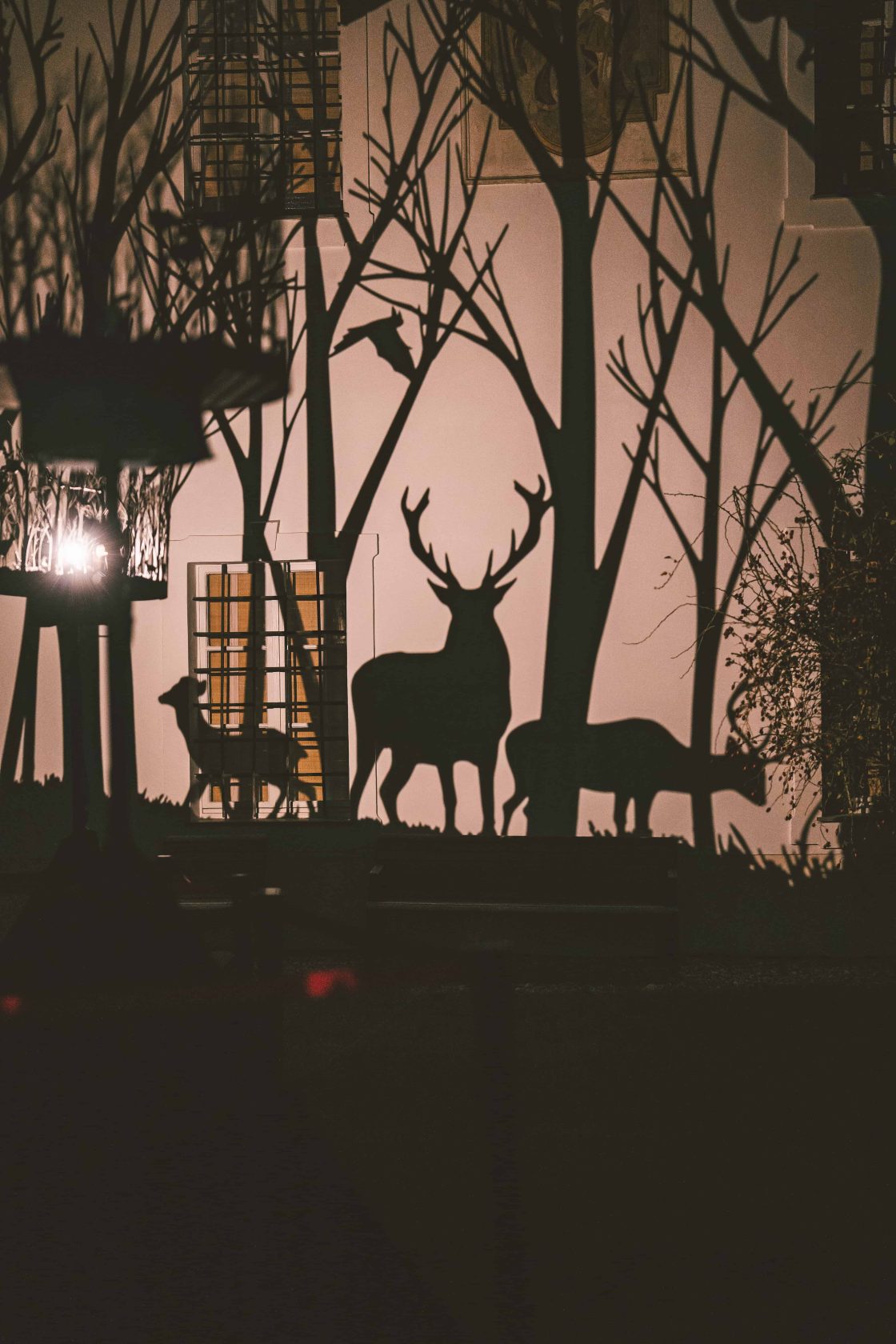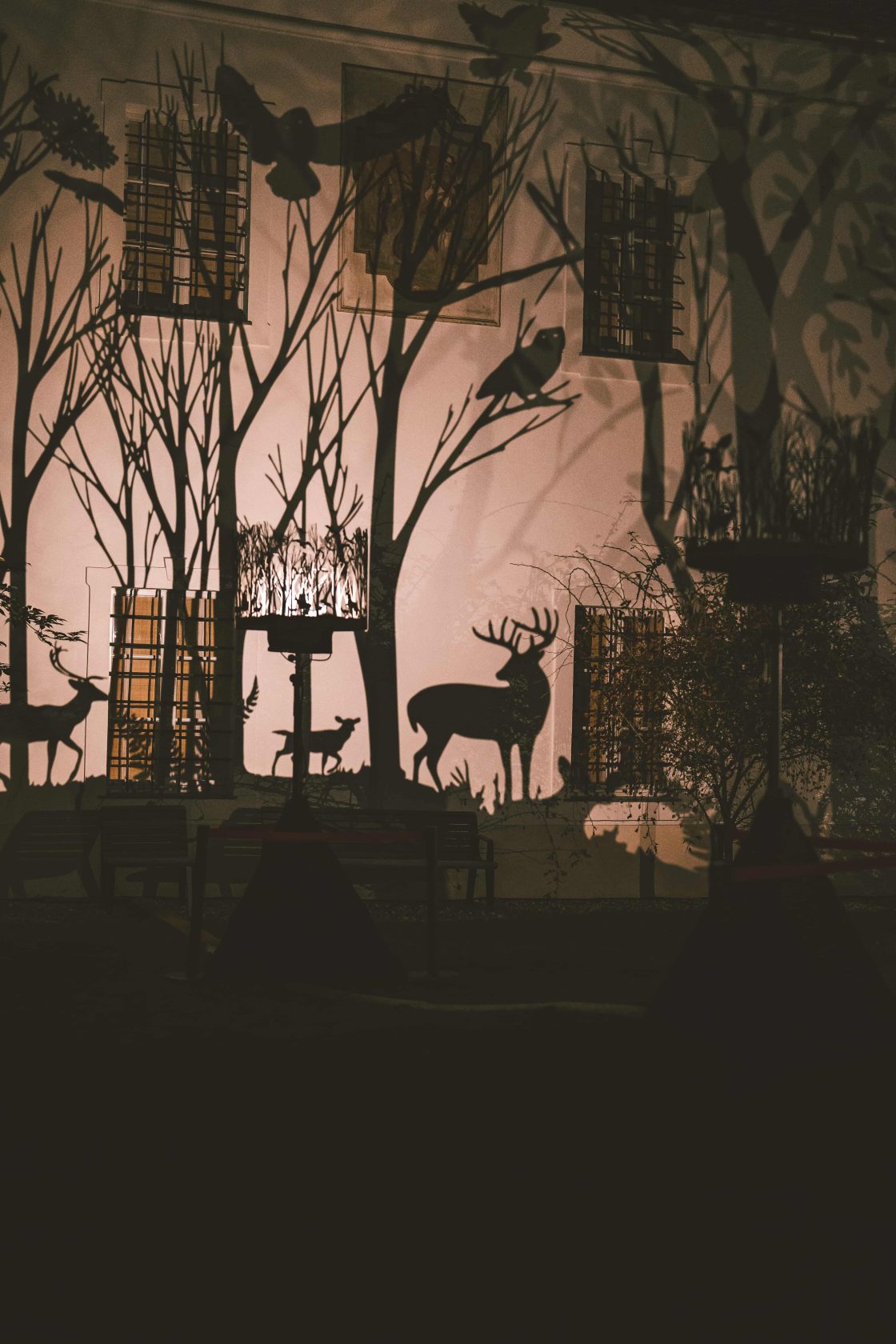 Im Innenhof des Volkskundemuseums entfaltet sich eine Landschaft aus Licht und Schatten, animierte Silhouetten tanzen über die Fassaden: Nachtaktive Tiere, Hirsche, Eulen, Füchse tauchen aus einem geheimnisvollen Wald auf. Die für Mythen und Geschichten spezifische Symbolik des Waldes appelliert an unsere kollektive Vorstellungskraft, uns mit der ungezähmten Natur zu verbinden.